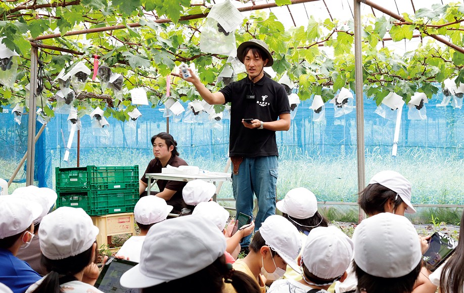 GEARFARM がある加茂町三代地区は昭和30年代から約50戸の農家がぶどう栽培に取り組んでいたが、現在残っているのは7戸だけ。少数になったからこそ、地域の宝を絶やさないようにしたいという思いが星野さんにはある。その思いは、地域の小学校でぶどう栽培について教える活動にも繋がっている。