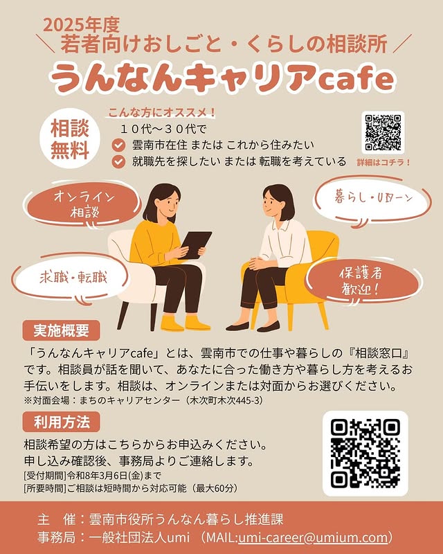 「うんなんキャリアcafe」をはじめます!〜2025年度 若者向けおしごと・くらしの相談所〜